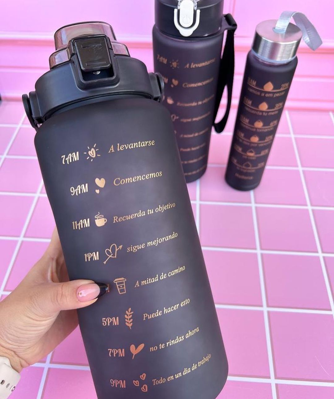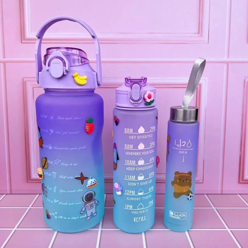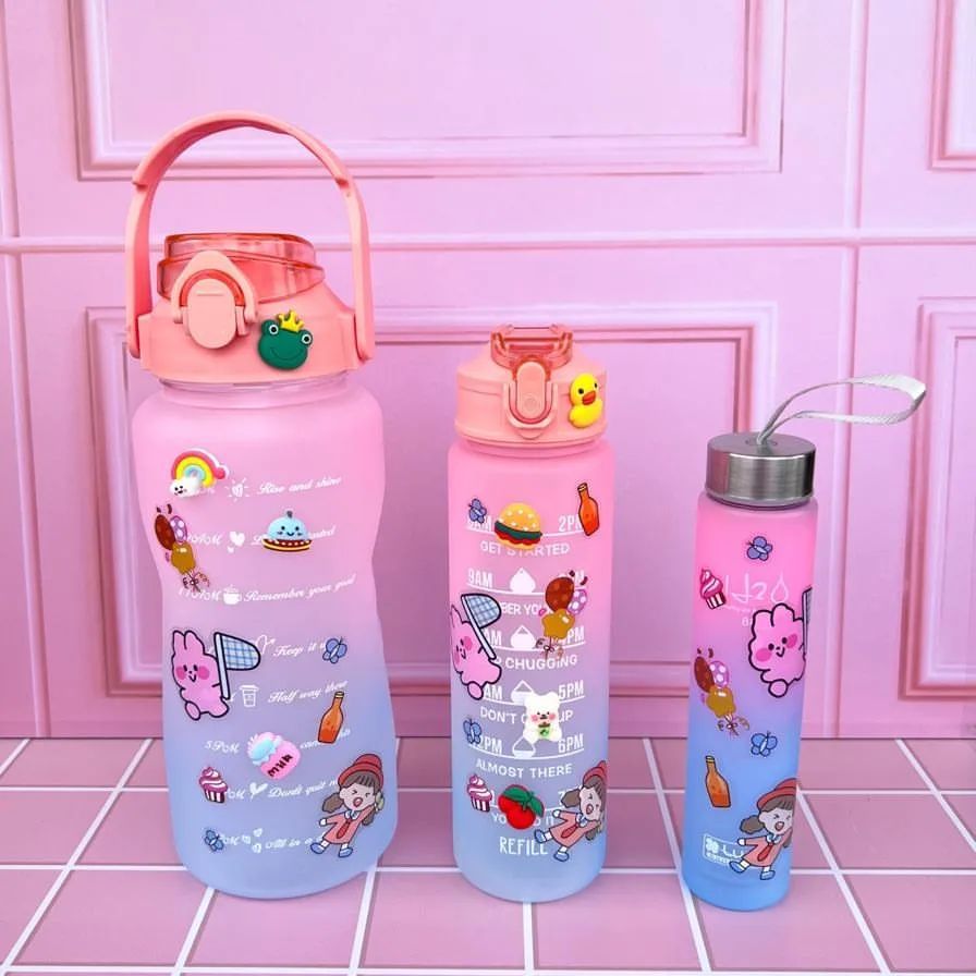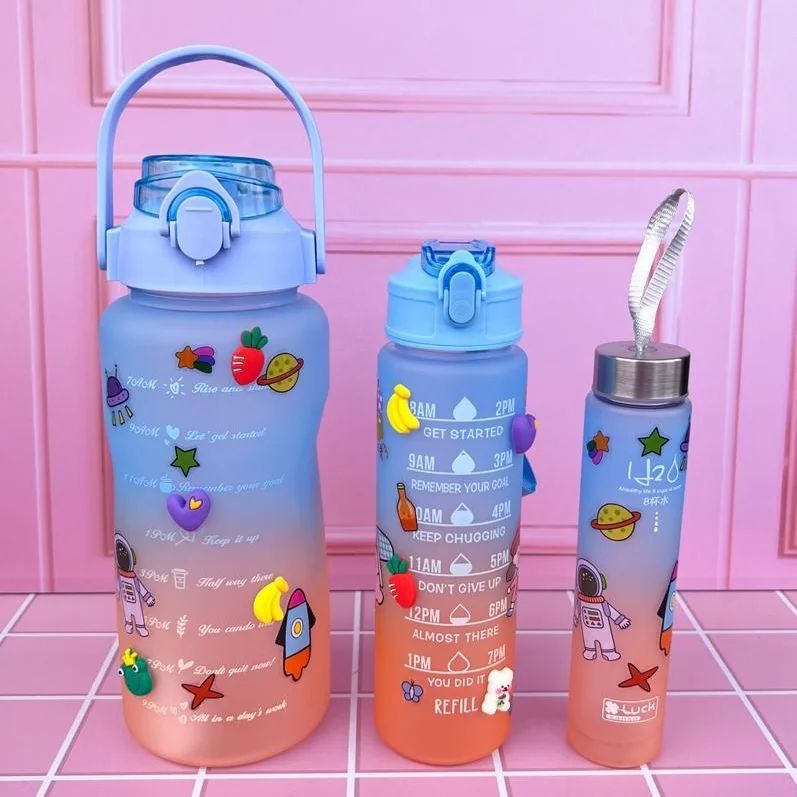 Botella Deportiva 3 piezas con capacidad de 2000ml, 1000ml y 330ml. Con cubierta de rebote, a prueba de fugas y con bello diseño Motivacional.